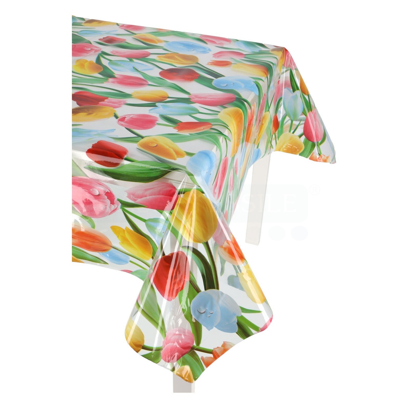 Gewachster rechteckiger Tischdeckentisch aus Kunststoff mit Transparenzen bis zur Meterhöhe von 140 cm.