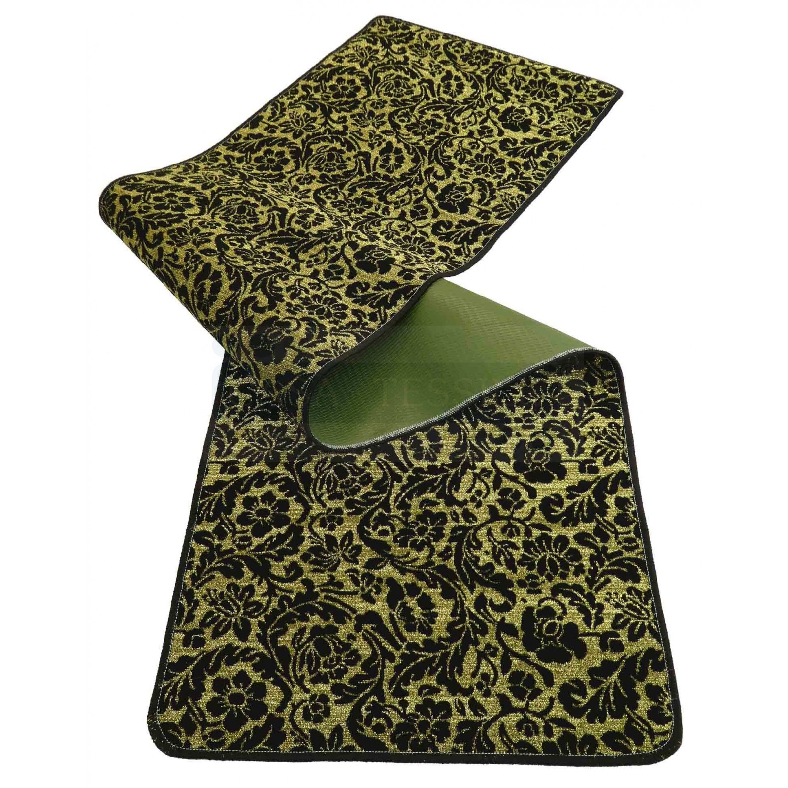 Ein kostbarer Teppich, auf einem glatten Sockel mit viel glänzendem und hellem Gold-Lurex-Garn in Reliefblumen und samtigen schwarzen Zweigen geboren, eine Fantasie, die an das Damastgenre erinnert, aber anmutig angereichert ist. Ein Effekt, der im Laufe der Zeit unverändert bleibt, Waschen nach dem Waschen, weil nicht gedruckt, sondern in Weben erstellt.