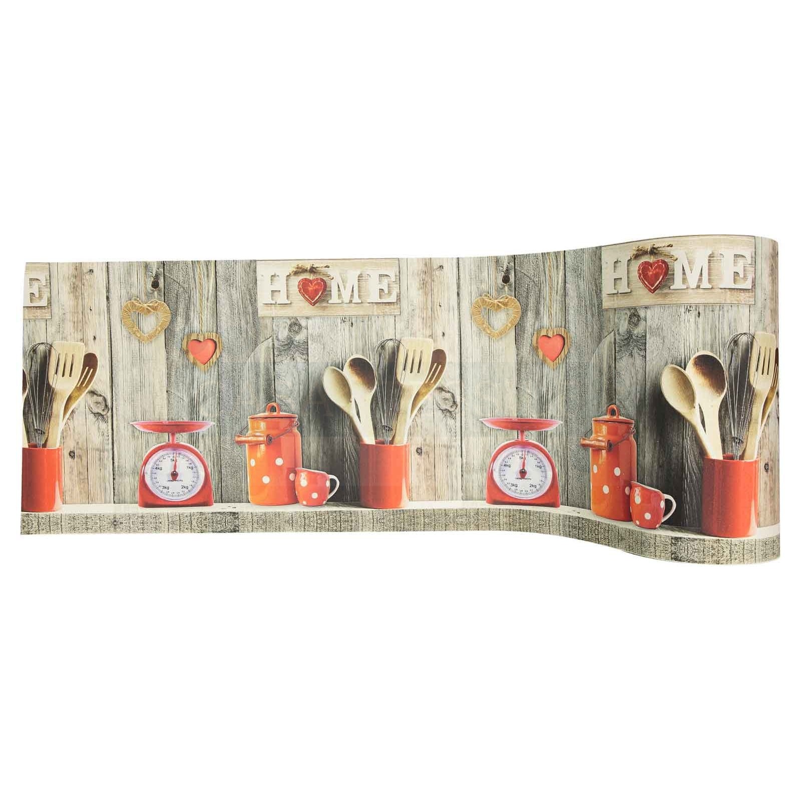 Ein Holzregal mit allen Küchenwerkzeugen im voll schäbigen Chic-Stil.