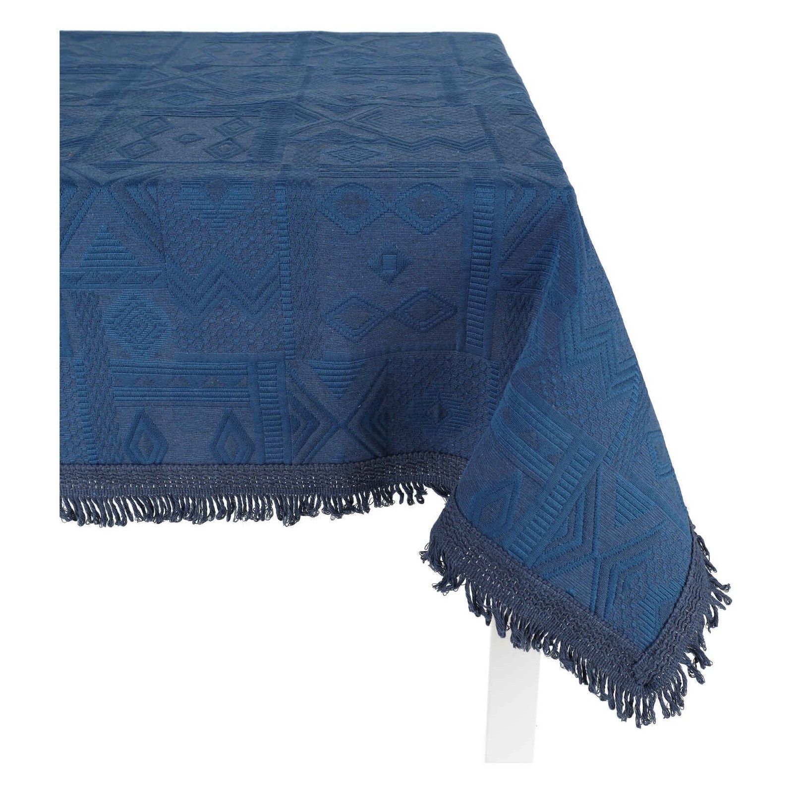 Das geometrische Muster mit ethnischer Anziehungskraft wird durch ein Fransen-Finish auf allen Seiten verstärkt.