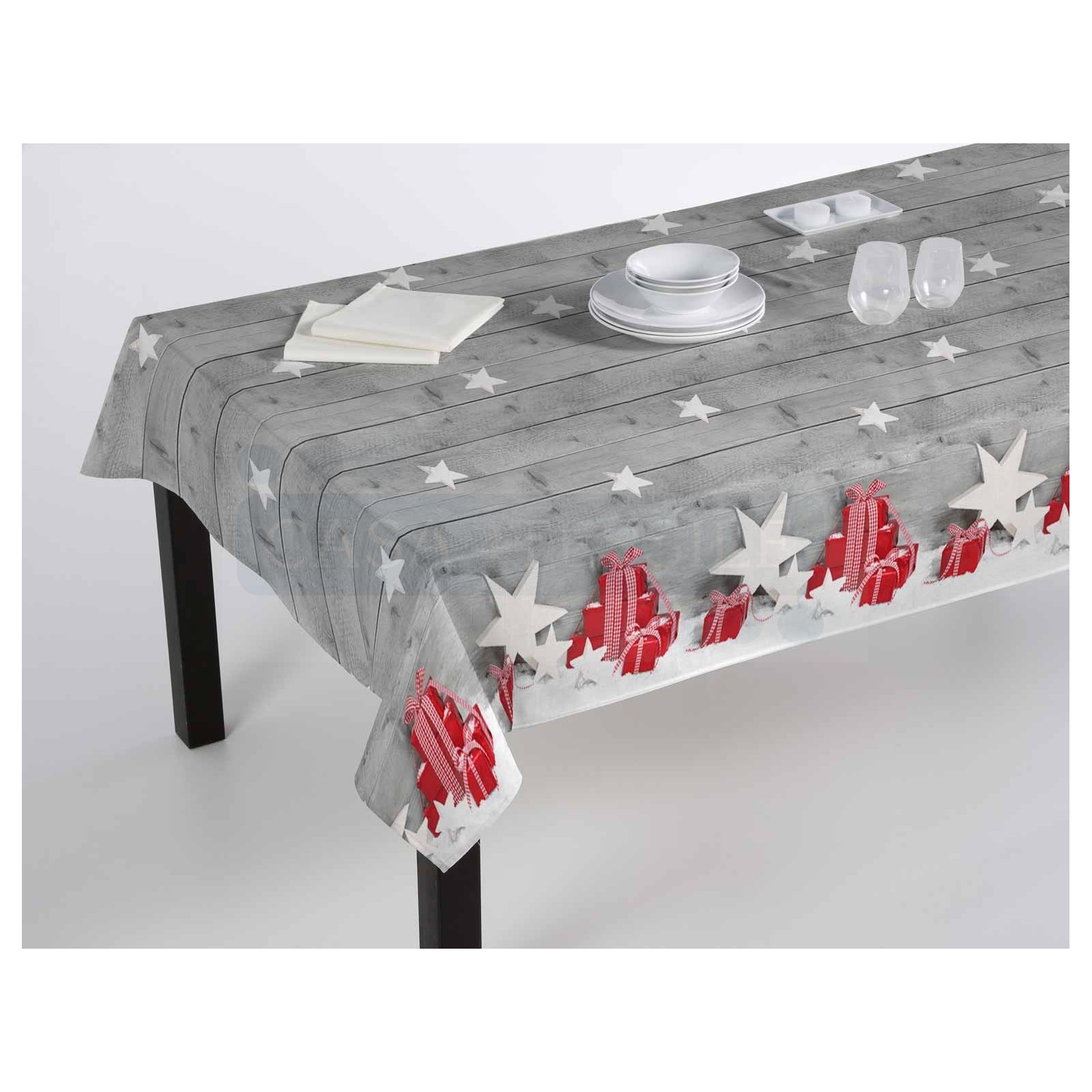 Ein schönes Weihnachtstisch Tischdecke, das von einer reinen Baumwoll-Leinwand kreiert wurde, die mit einem digitalen Aufdruck verziert ist, eine graue Holzsohle mit vielen Geschenkpaketen, die auf einem Bett aus weißem Schnee unter einem Hagel von Sternen ruhen.
