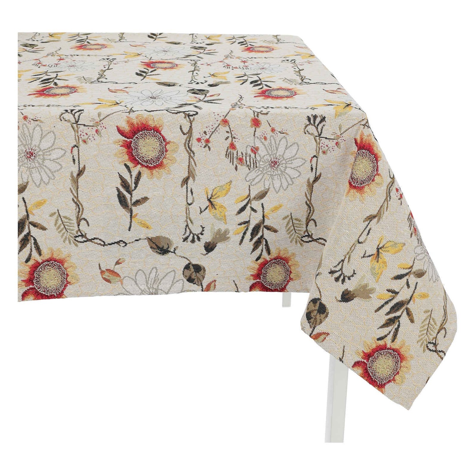 Elegante Sonnenblumen und Zweige sind auf einem cremefarbenen Hintergrund verstreut, die zusammen ein anmutiges Blumenmotiv auf der gesamten Tischdecke bilden.