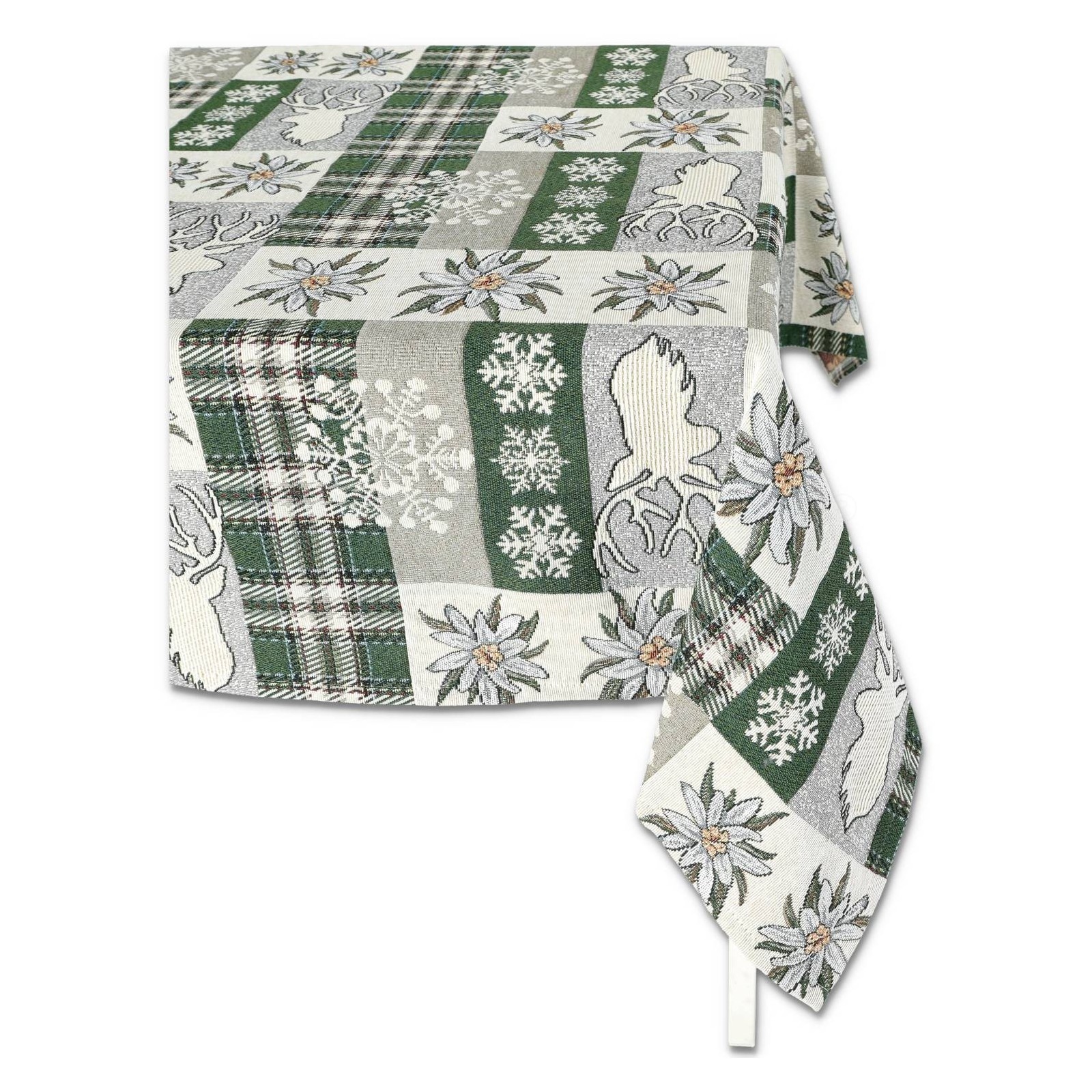 EDELWEISS: prächtige Gobelin-Tischdecke im Tiroler Muster zwischen Schottenkaro und Natur, allseitig mit Hosensaum gesäumt..