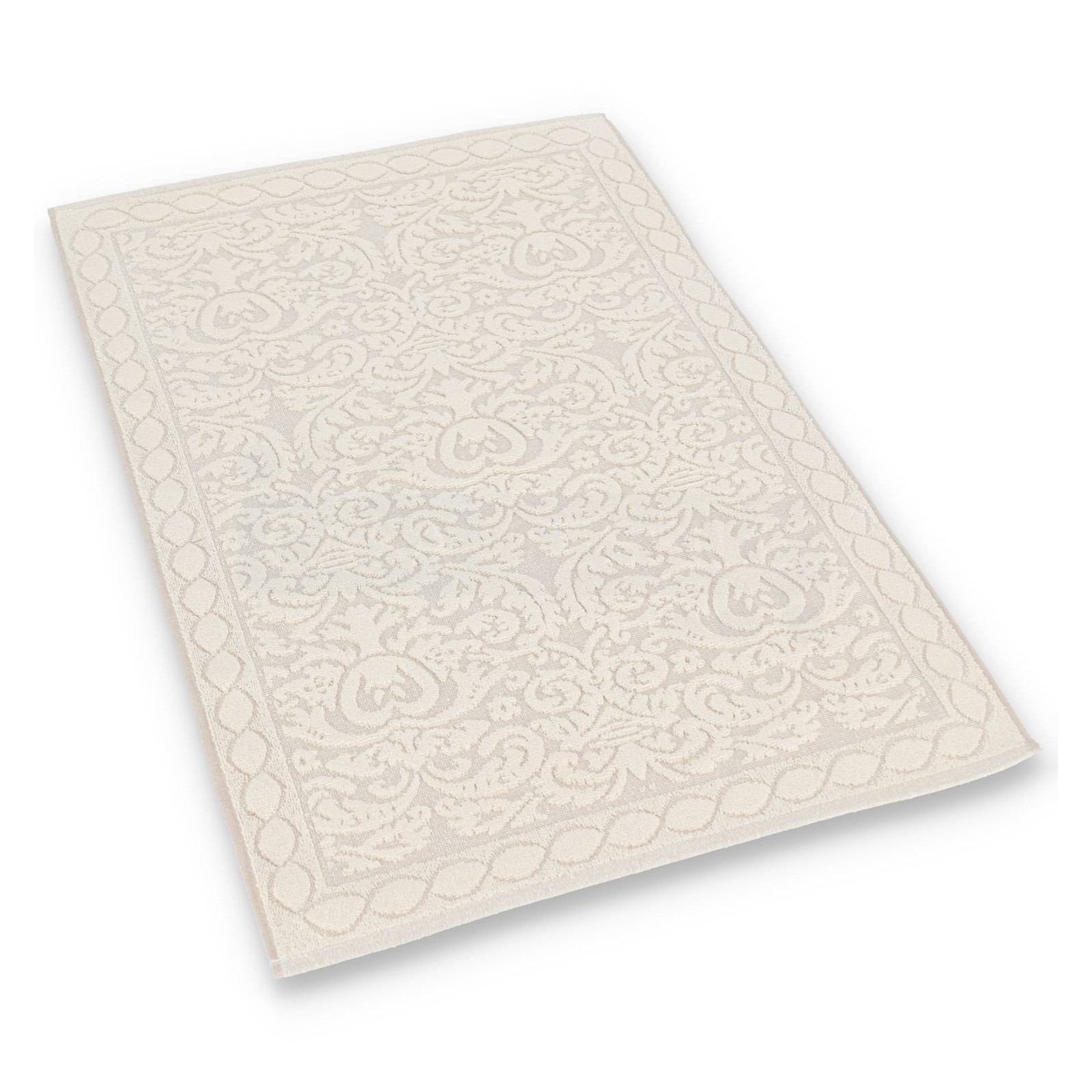 DOUBLE FACE: Absorbent cotton blend bath mat created with the sponge processing where the curls alternating with the smooth texture create the embossed design that is finished and beautiful even on the reverse allowing you to use it on both sides. Refined and elegant thanks to the soft colors that make it easy to combine..
