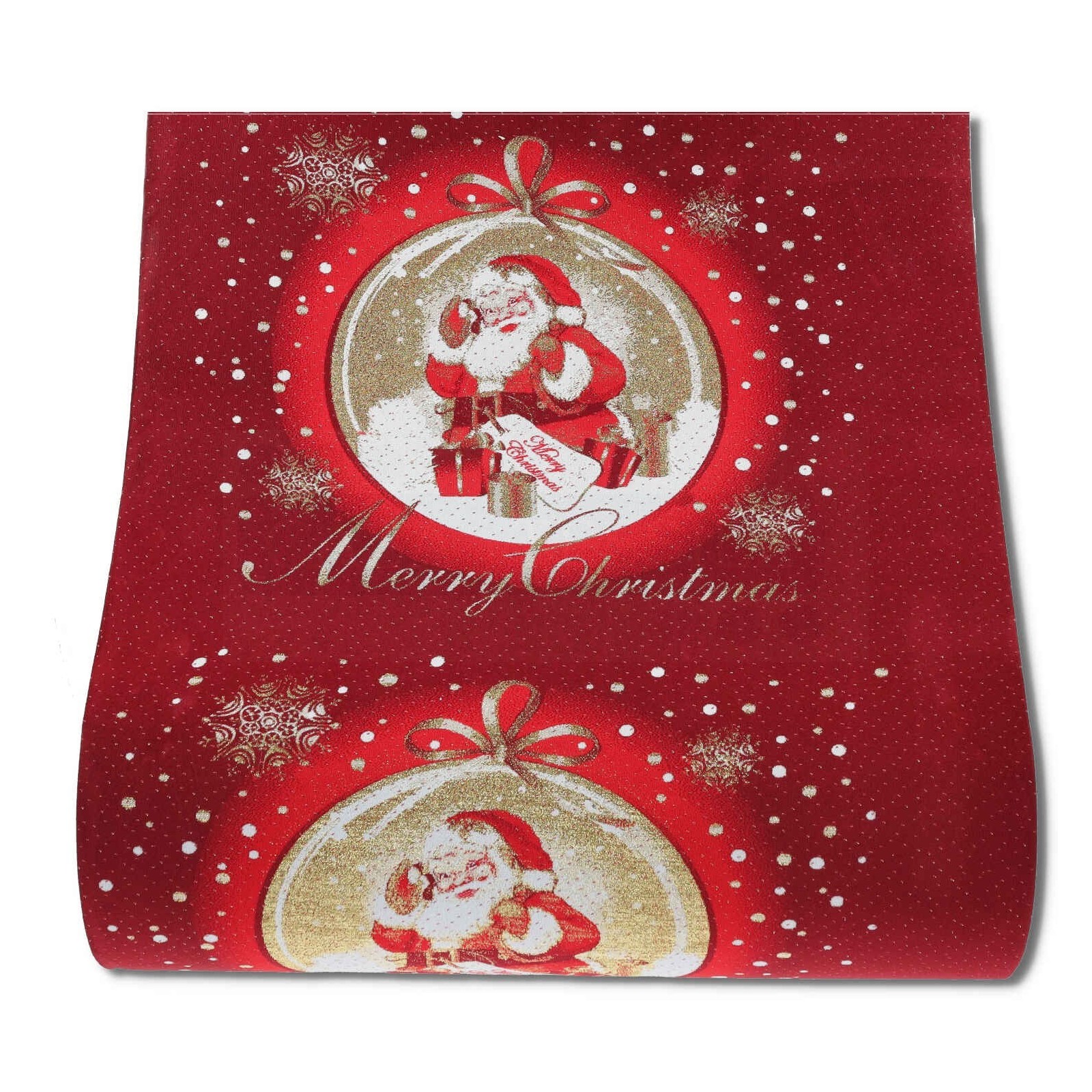 Christmas runner with resin-coated substrate and raw edge. The auspicious writing can be Merry Christmas or Merry Christmas in random delivery for 1 unit, in multiple lengths they will alternate.