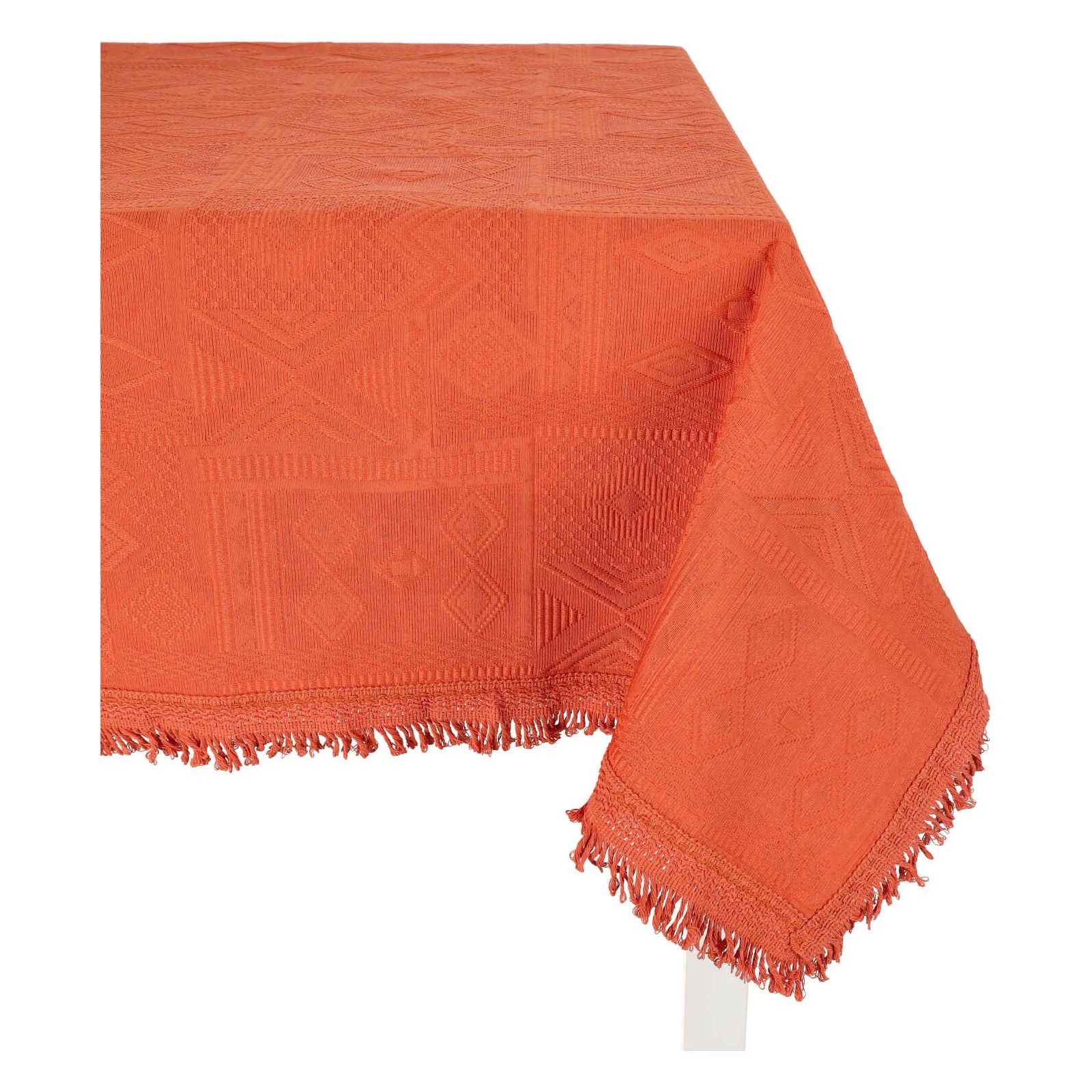 The geometric pattern with an ethnic appeal is enhanced by a fringe finish on all sides.