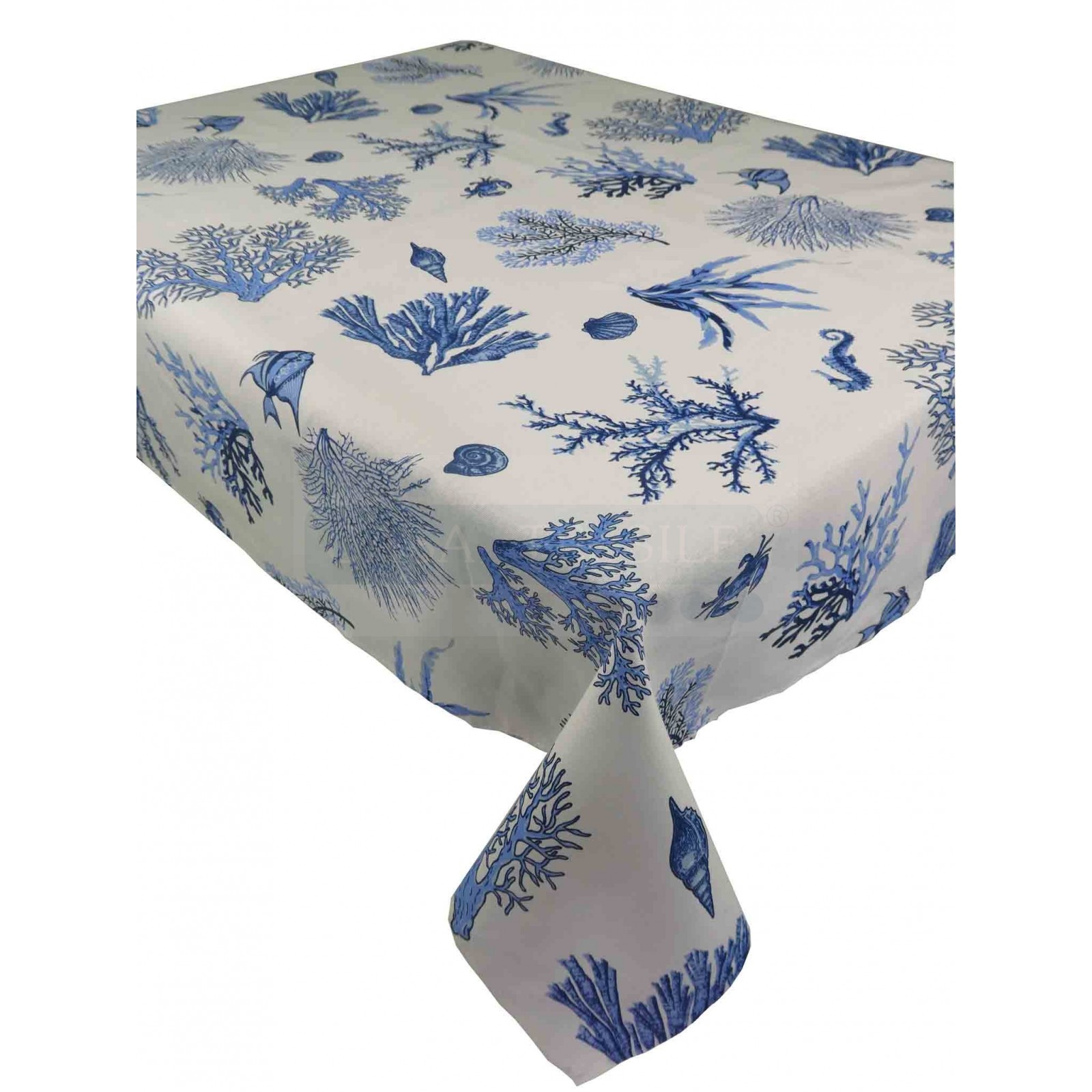 A fresh and carefree marine pattern printed on a cotton canvas with a consistent hand and white coloring on which shells, algae and corals stand out, offered in several variants to dress your table according to your tastes..