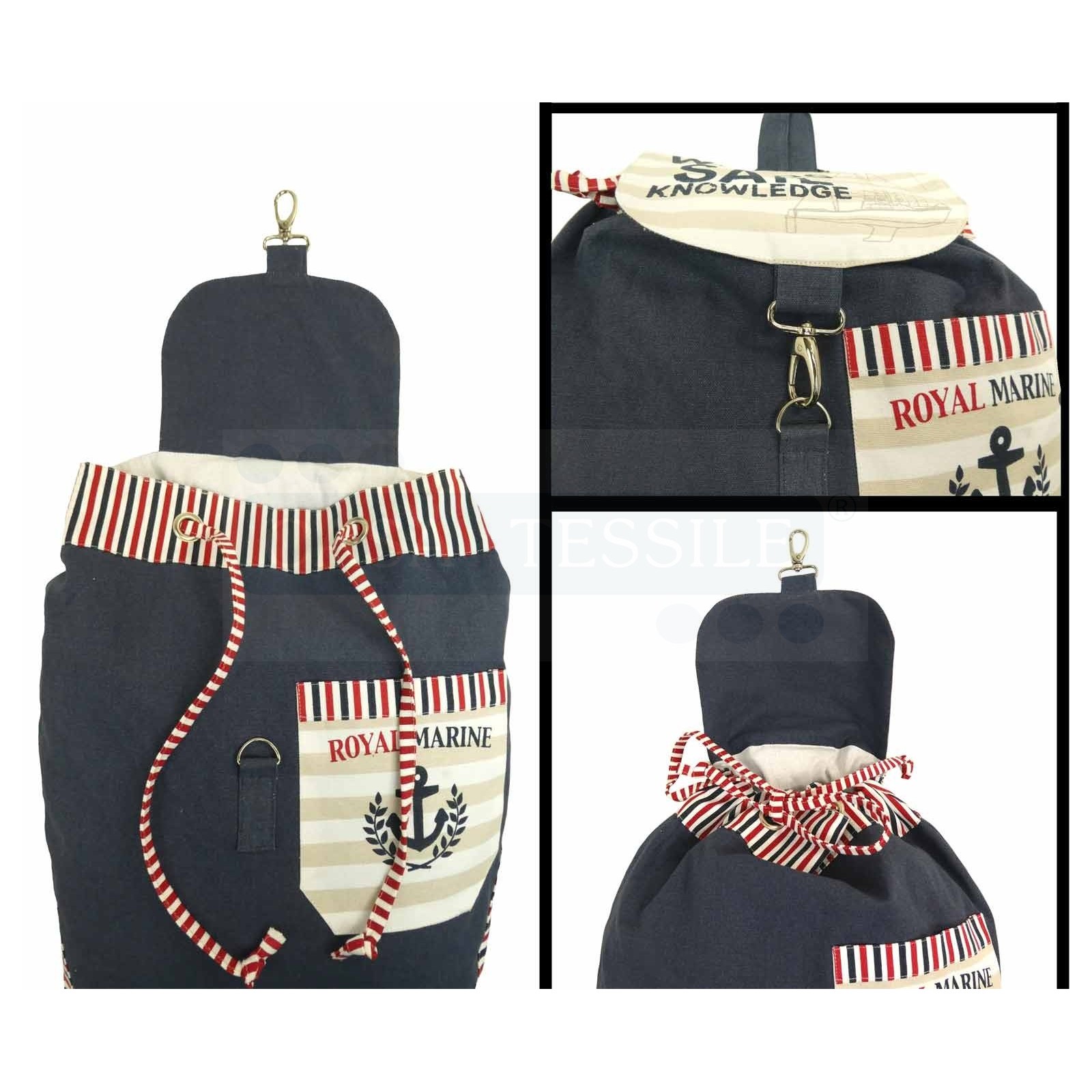 It has a pocket in front garnished with an anchor printed and 2 triangular pockets with zipper on the 2 sides, ideal to separate small objects and keep them safe..