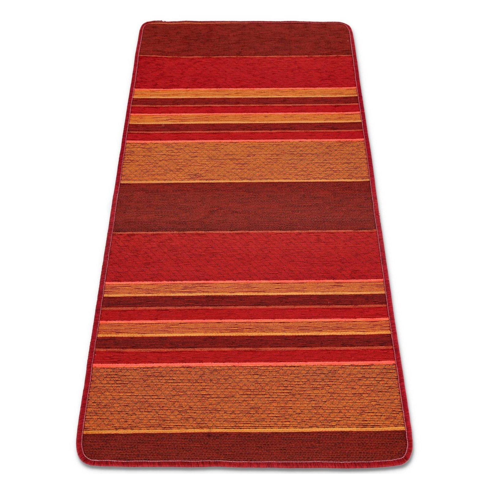 FUNCIONES: En tejido Jacquard con hilos de chenilla con un diseño de rayas no estampado sino creado en tejido y unido a un fondo termoplástico antideslizante para crear una alfombra resistente y práctica, firme en el suelo y sobre todo fácilmente lavable a máquina. Overlock con bordes redondos con esquinas redondeadas y solo 5 mm. grueso..