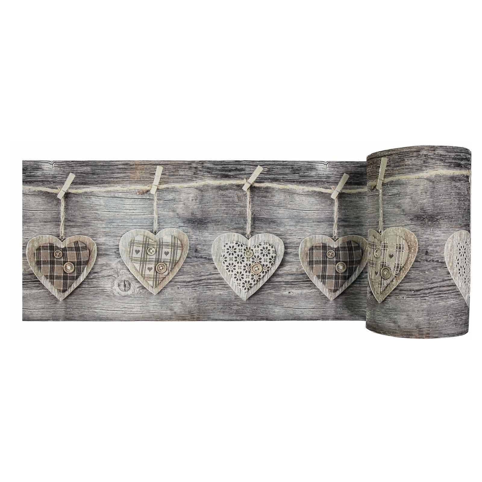 Una impresión digital con excelente resolución para un efecto chic en mal estado en su hogar. Un parquet sombreado con una extensión de corazones de madera cada uno elegantemente decorado con tela y botones, colgando como para secarse al sol..