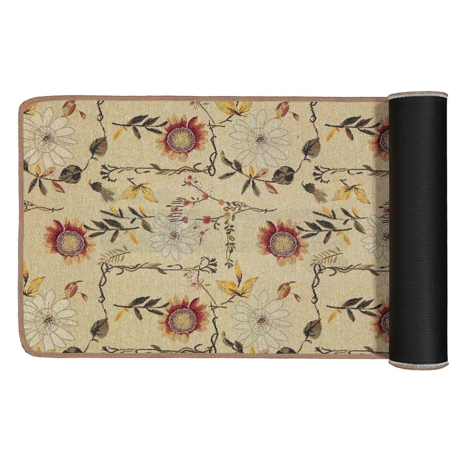 Una base natural sobre la que se encuentran girasoles laicos y otras flores entre ramas y hojas, no impresas sino creadas con procesamiento jacquard para una primavera eterna en su hogar.