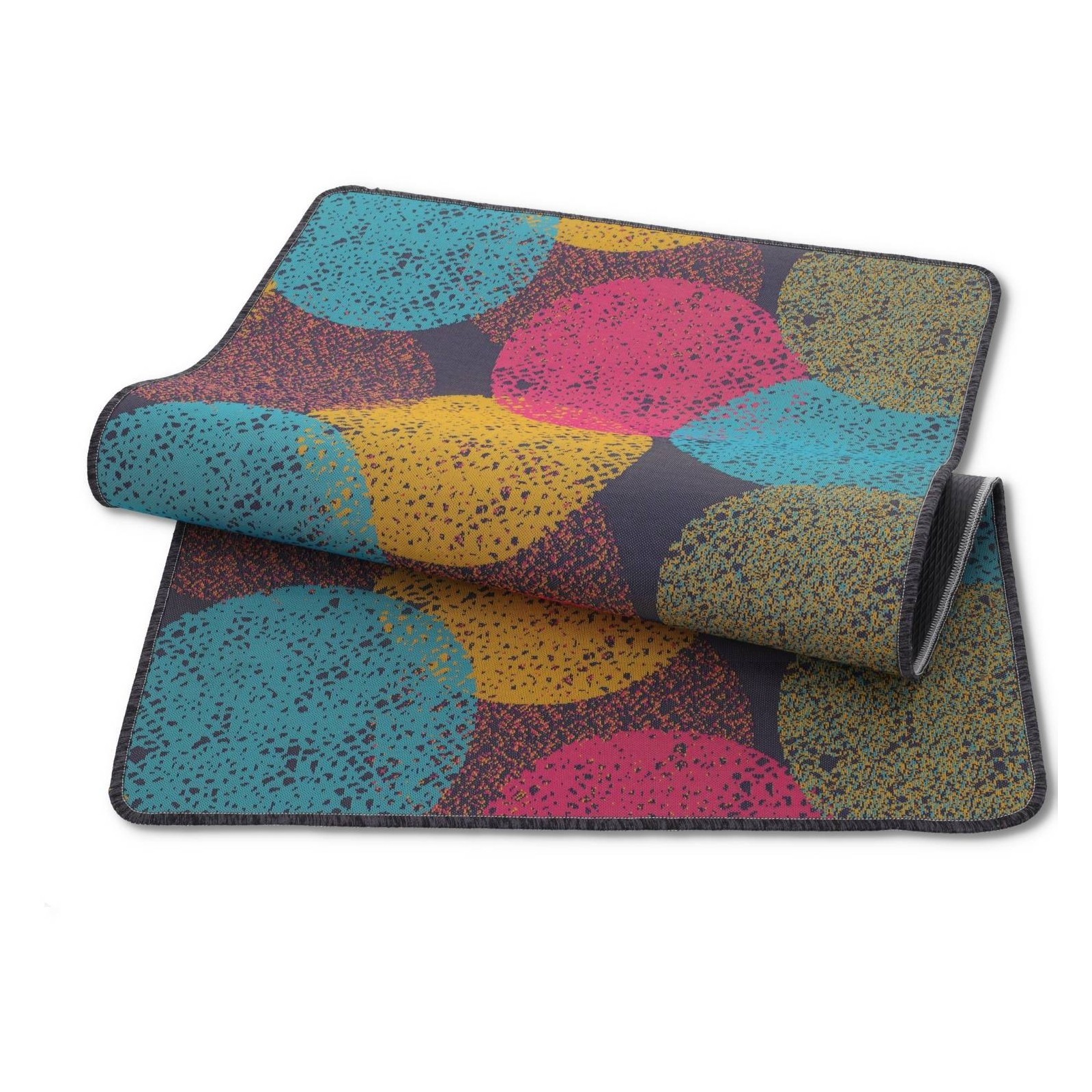 FUNCIONES: Un corredor con una imaginación explosiva y lleno de colores como fuegos artificiales, con una mano suave cuyo lienzo y diseño se crean en tejido con la elaboración del jersey. Junto con una capa de subsuelo antideslizante de goma para que sea firme y estable en el suelo y acabado con overlock en todo el perímetro con esquinas redondeadas..