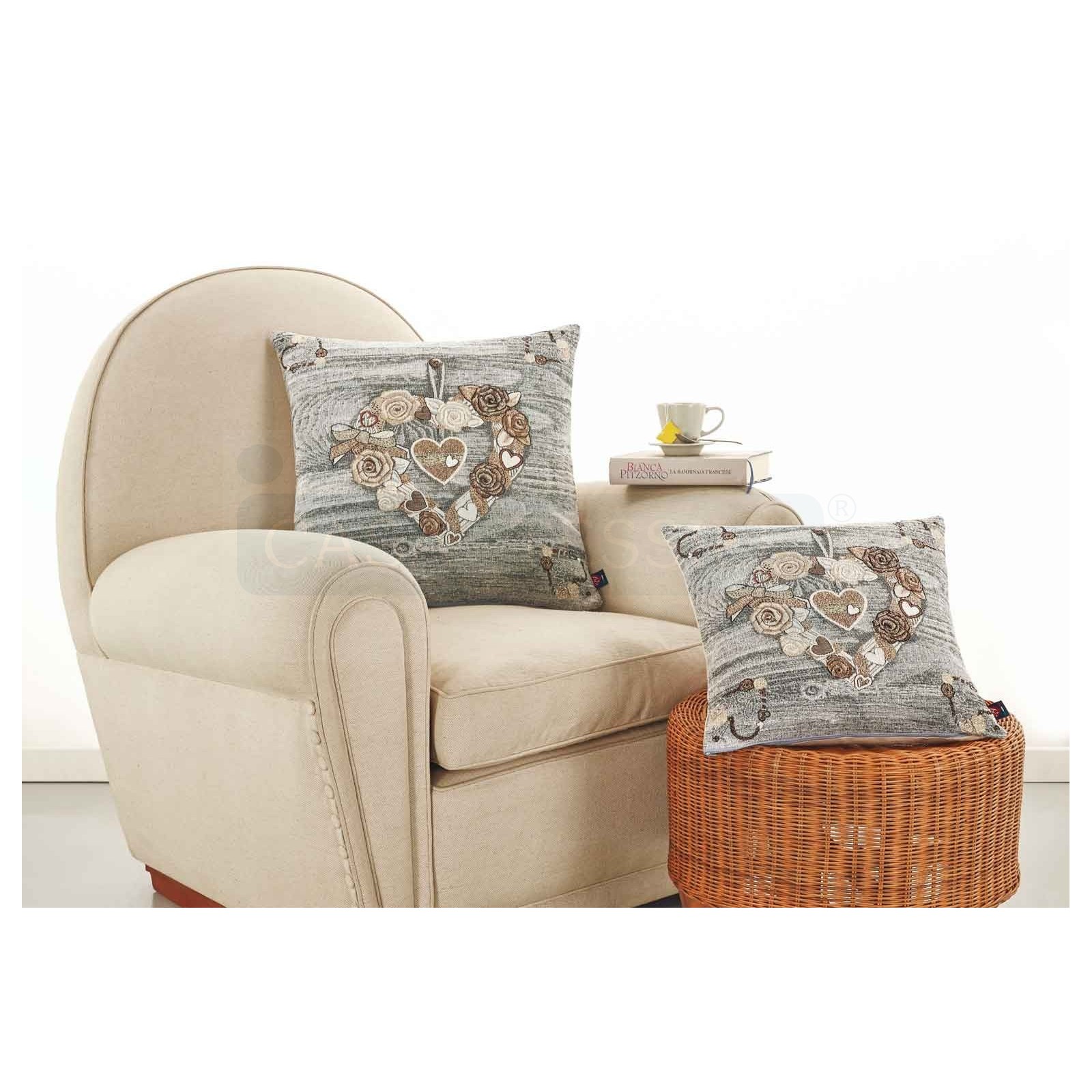 La cara superior está en carnille,delicadamente adornada con una gran guirnalda de flores en forma de corazón colocada en el centro y completada por otras pequeñas guirnaldas colocadas una para cada esquina. El hilo cinilla le da a la funda de almohada un toque de brillo y movimientos de alivio aterciopelado.
