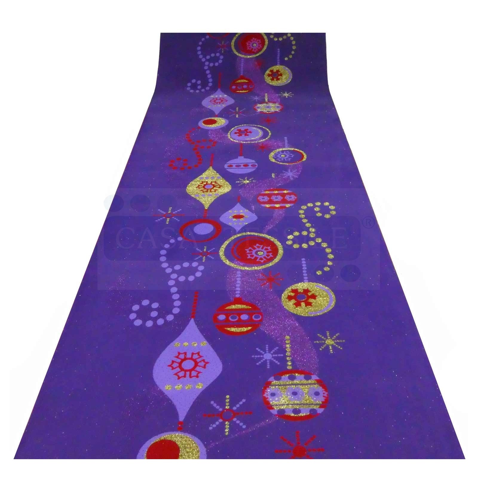 UNA alfombra púrpura salpicada de oro y plata puntos de luz con adornos, guirnaldas y bolas en una danza sinuosa de la festividad..