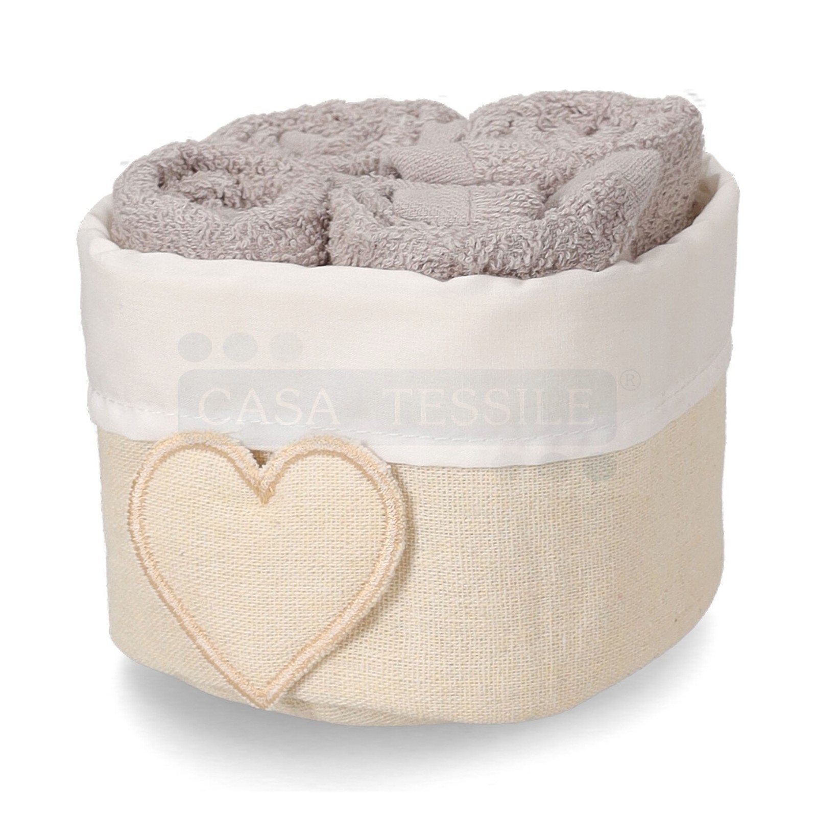 La cesta está creada a partir de un lienzo con una mano gruesa y color natural, el borde superior está acabado con unos bonitos adornos y completado por 1 corazón bordado, siempre en tela.