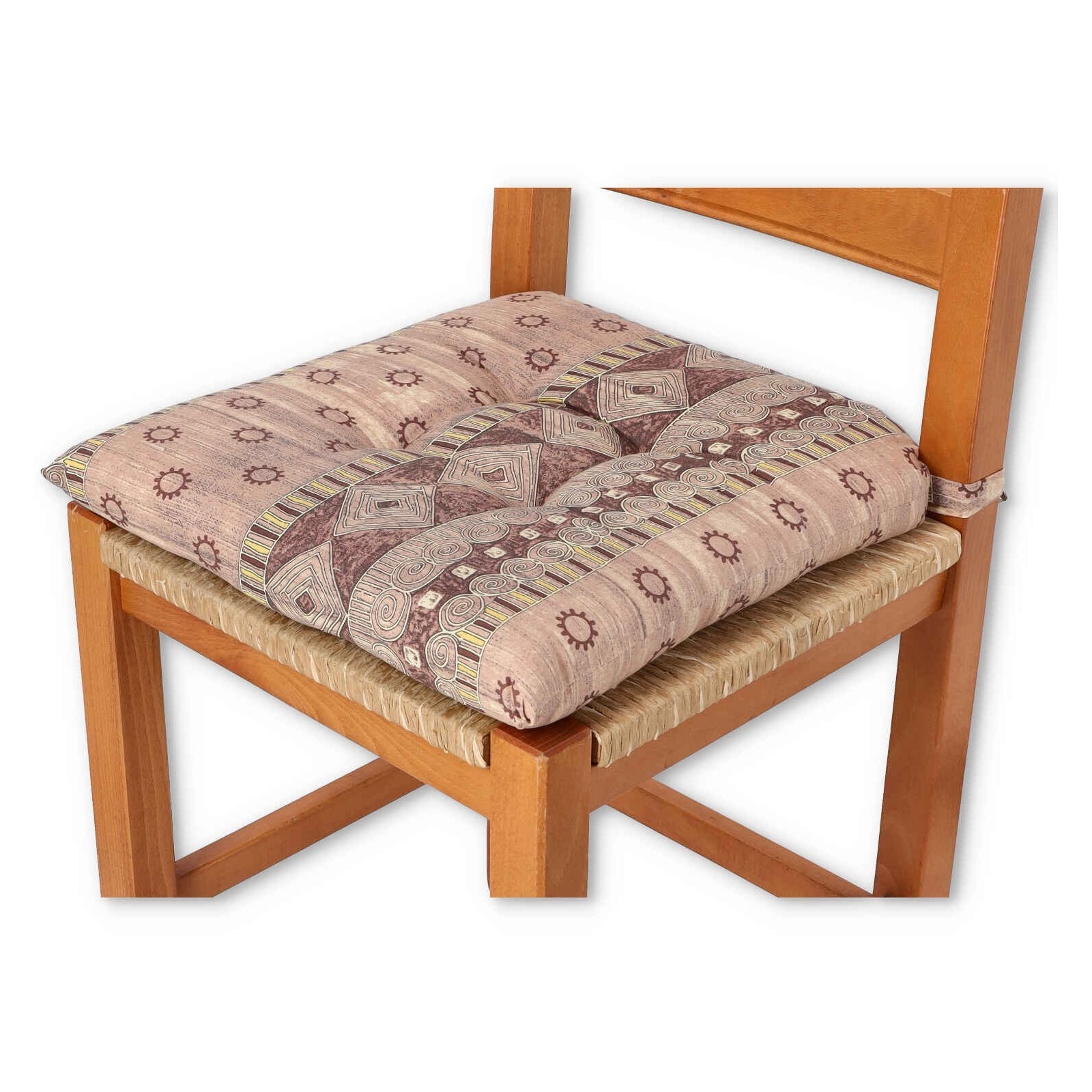 Un coussin avec un tissu imprimé avec un design de goût ethnique créé par l’alternance de rayures, de soleils, de pots et de losanges, avec des nuances nuancées et l’alternance de différentes nuances mais sur le même ton..