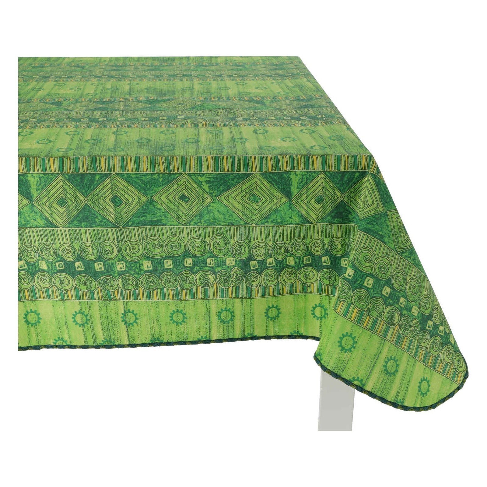 Coton tissu nappe plastifié avec des couleurs flashy et ethnique appel créé par une alternance de lignes, soleils, roulades et turbot de nuance et ombragée par une alternance de teintes différentes, mais dans le même ton.