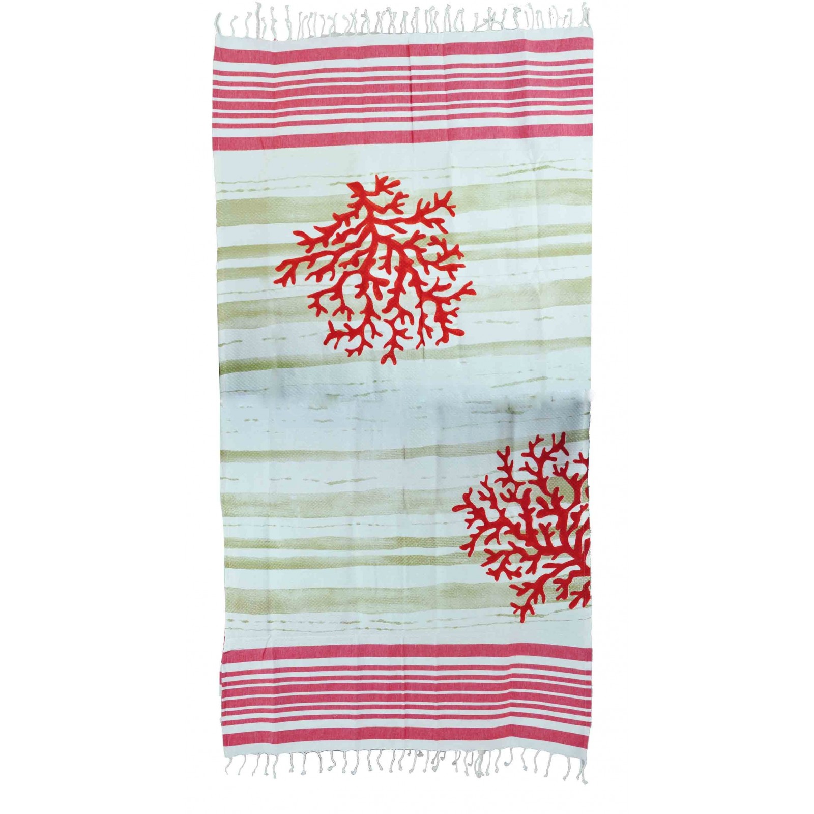 Les bandes rayées des côtés opposés 2 à 2 sont construites en tissé teint et apparaissent sur l’avers et sur l’envers du tissu, alors que le motif central de vagues et de coraux est imprimé seulement sur le côté coup droit.