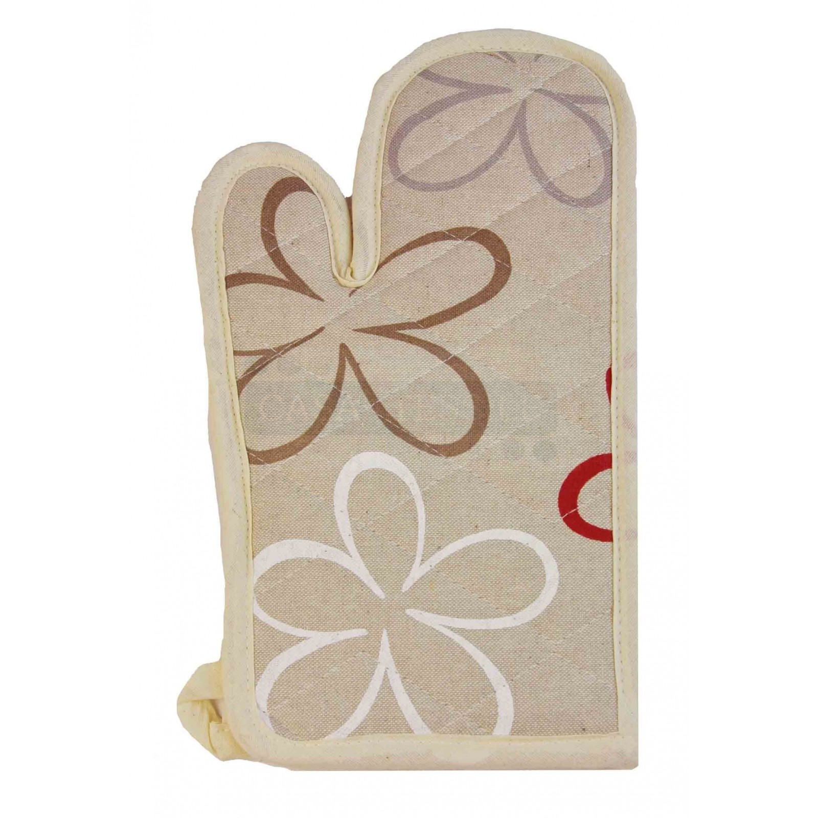 Lo strato esterno è di questo tessuto stampato accoppiato ad una fodera bianca che rimane internamente al guanto e racchiudono nel centro un'imbottitura sottile per permetterti una buona presa ma necessaria per evitare di scottarti. Il tutto è trapuntato e rifinito con una fettuccia in tinta della stampa che orla i 4 lati e forma su di un angolo il gancetto per poterlo comodamente appendere..