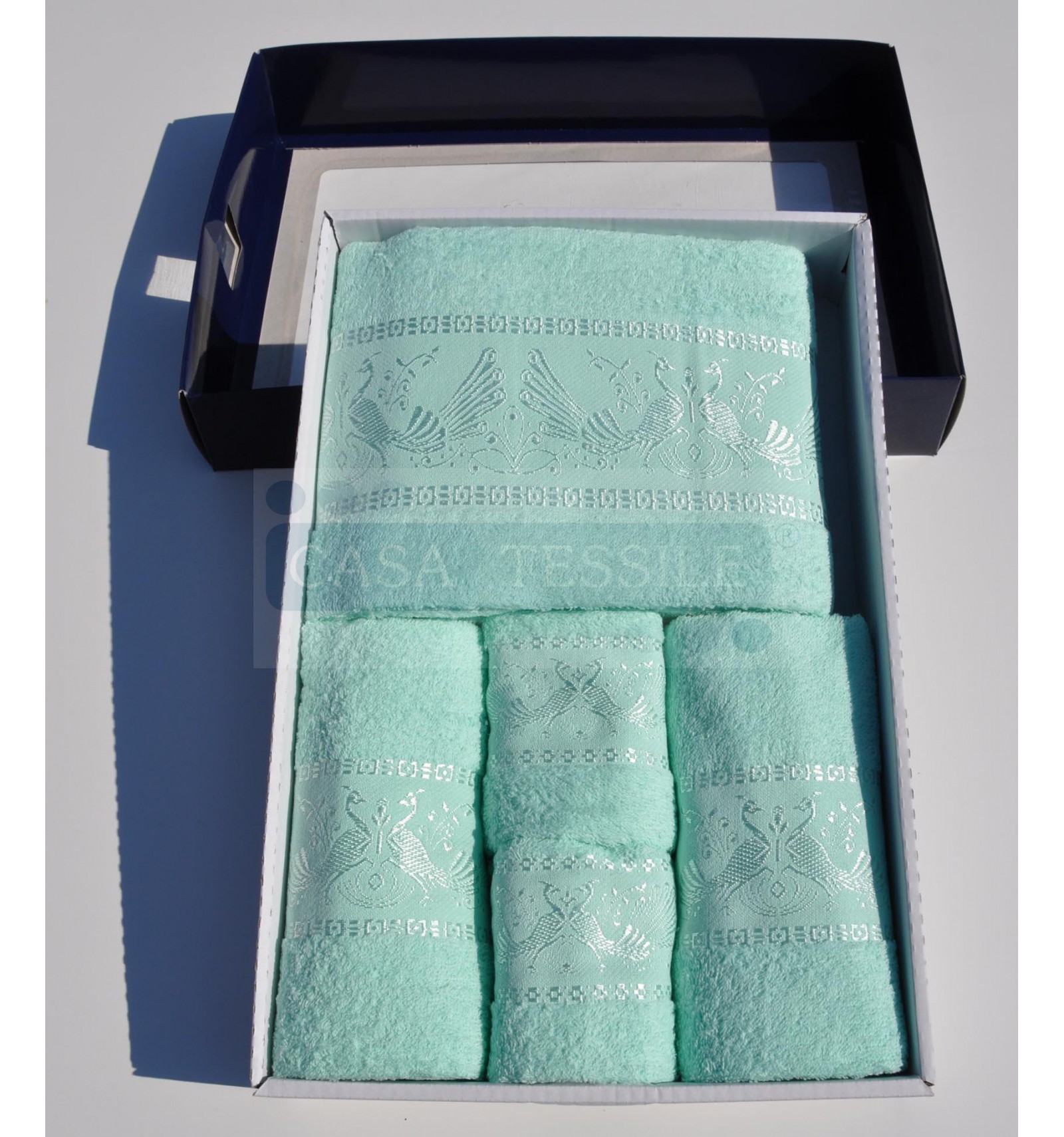 Il set 5 pezzi contiene 2 asciugamani 60x100 cm , 2 ospiti 40x60 cm e un telo 100x150 cm..