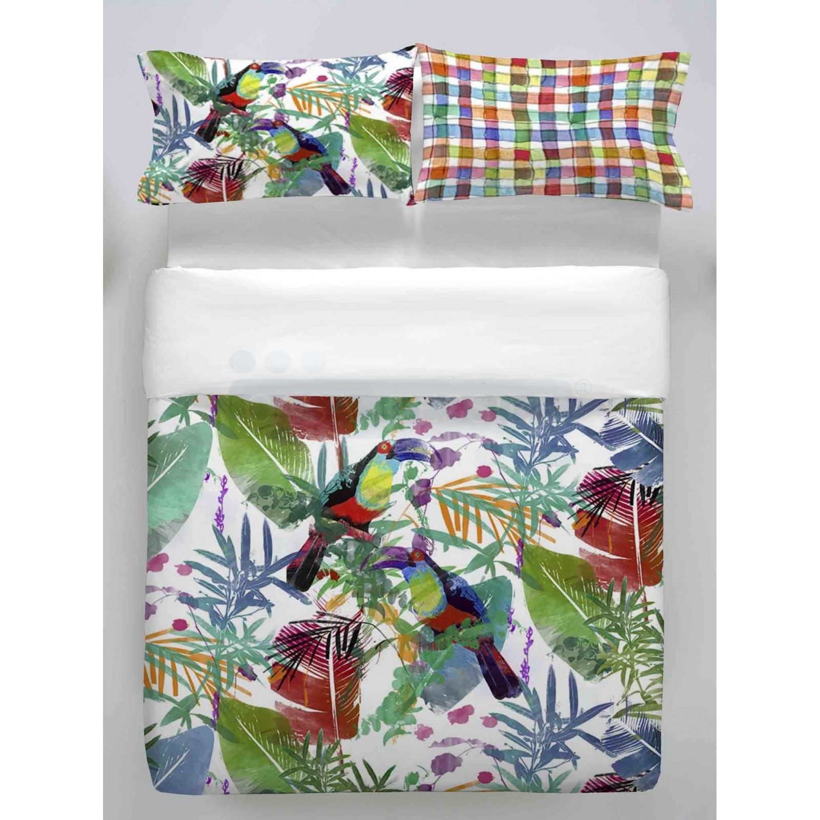 Il tuo letto una giungla, tra foglie e rami 2 grossi uccelli dal piumaggio colorato fanno capolino..