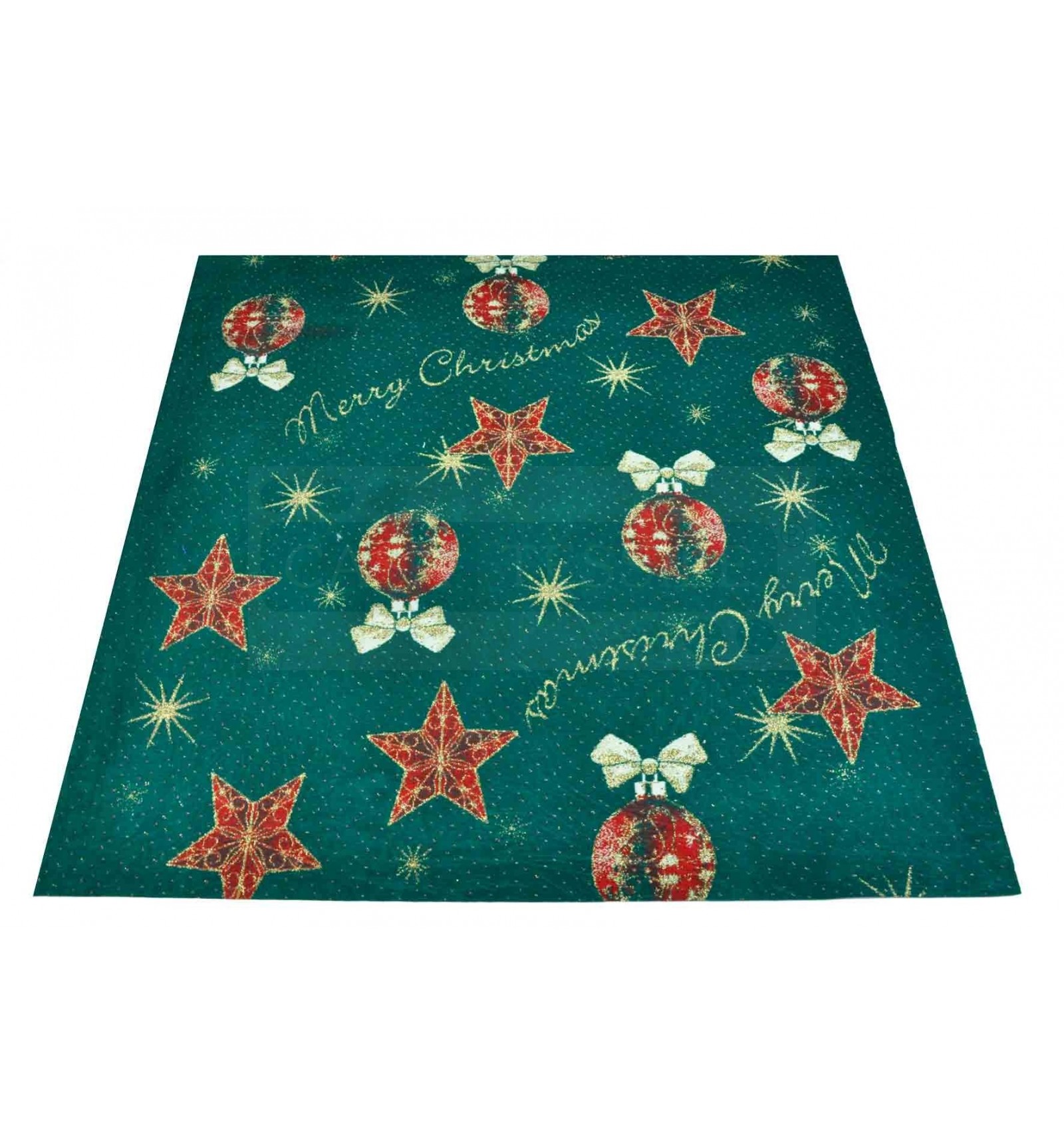 Tappeto dal fondo verde con tanti piccoli puntini rossi e oro, fa da sfondo a stelle e palline rosse graziosamente abbellite da tanto colore e luce grazie al filato lurex con cui sono arricchiti..