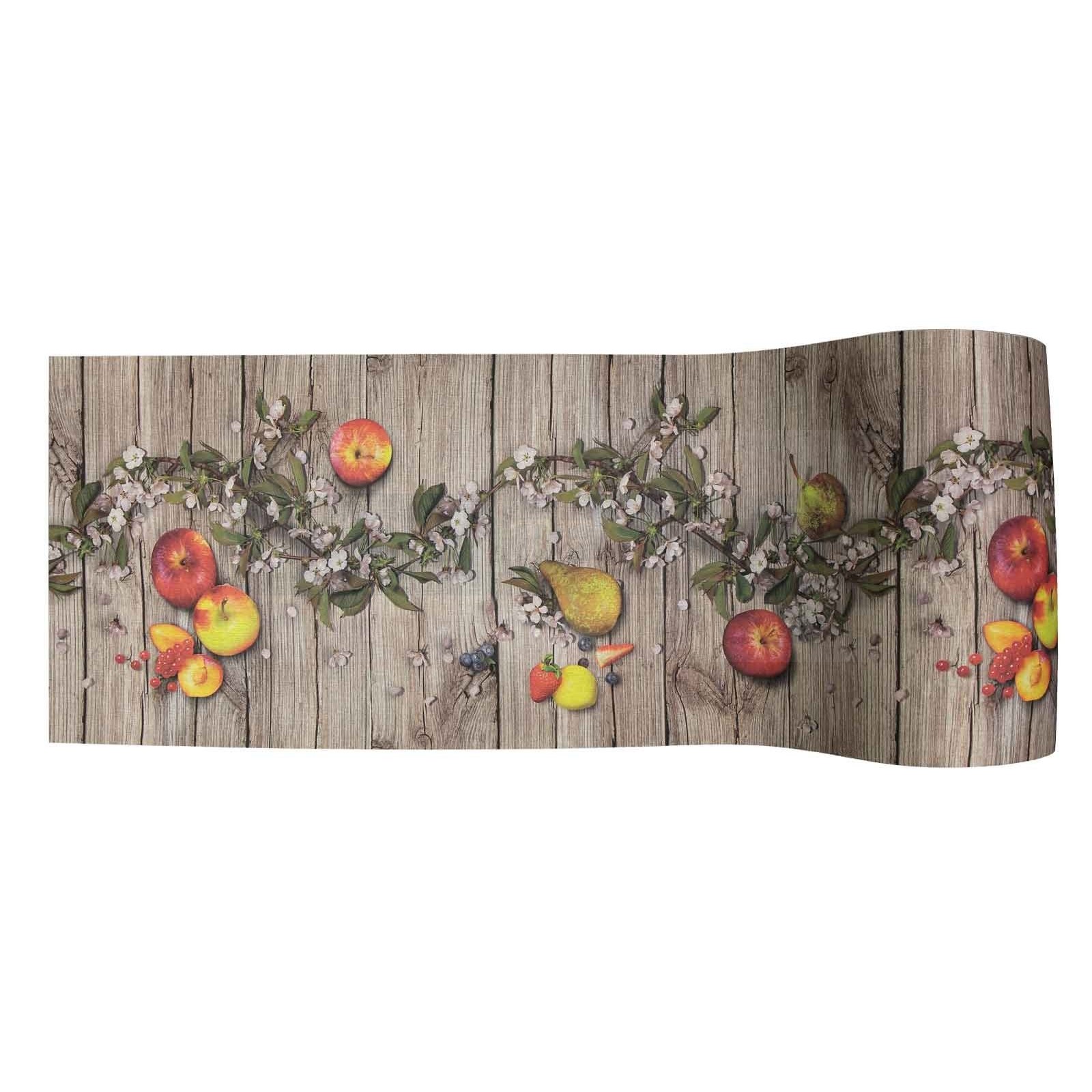Una stampa digitale con un'ottima risoluzione per un effetto primaverile in tutta la casa, su di una base di legno rametti fioriti si alternano a frutta fresca in un'onda colorata.