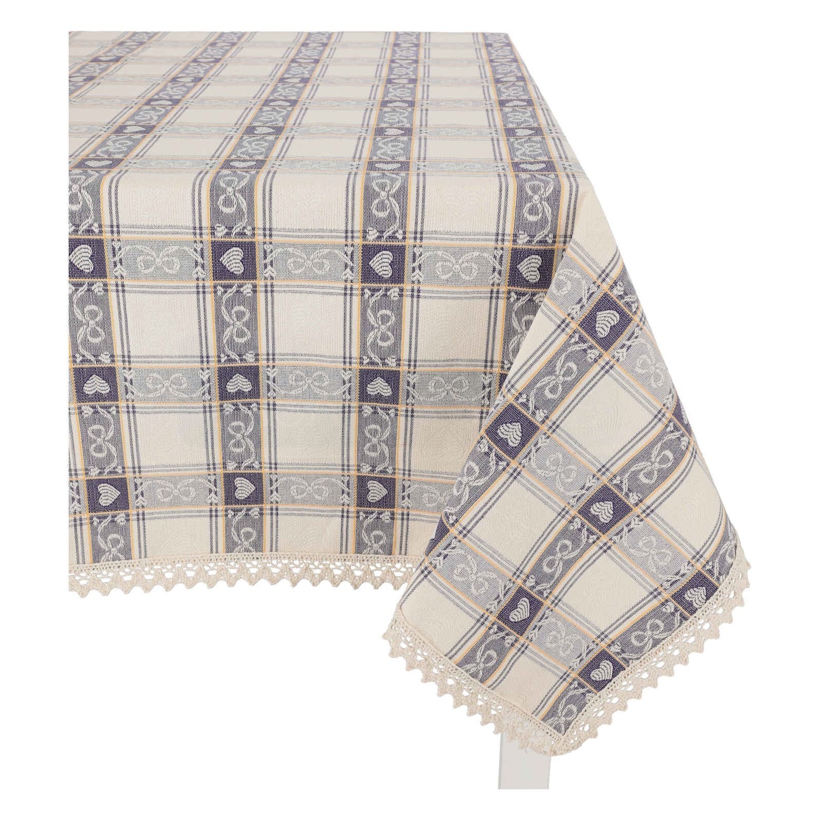 Un classico tirolese rivisitato in chiave shabby chic con fiocchi e cuori, una tovaglia di qualità il cui disegno non è stampato ma creato direttamente in tessitura grazie alla lavorazione jacquard con l'utilizzo di filato in puro cotone ritorto..